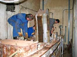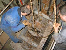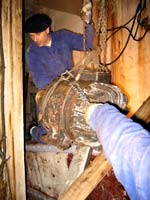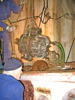 After many sessions, a major step has been achieved, the completely reconditionned "eclipse" motor reaches its original location. Next step is the connection to the electrical power supply network.