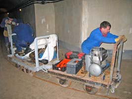 Part of the team load the wagons with the material while the other part of the team prepare the generator to supply current for the freigth elevator.